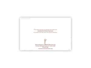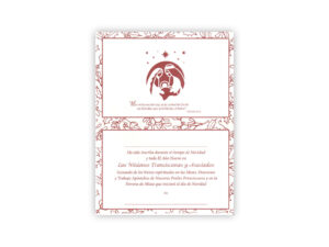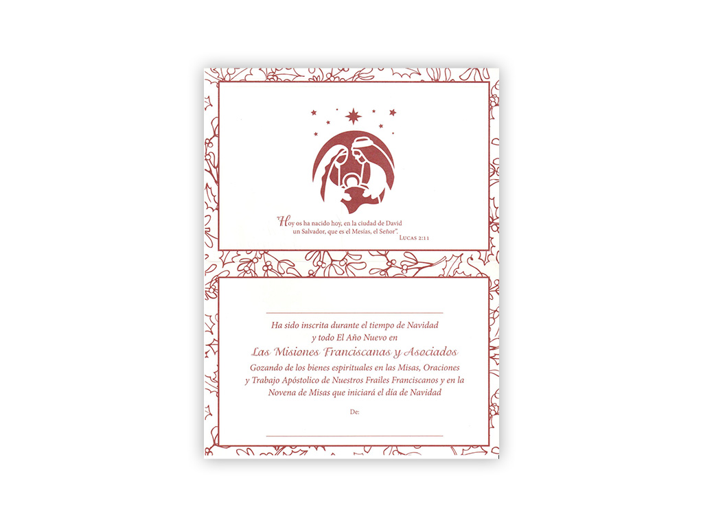 Esta tarjeta de inscripción navideña presenta una tierna escena de María y José contemplando con amor al Niño Jesús en el pesebre. En el interior, contiene el pasaje bíblico: “Hoy les ha nacido un Salvador… Encontrarán al niño envuelto en pañales y acostado en un pesebre.” (Lucas 2:11–12)
