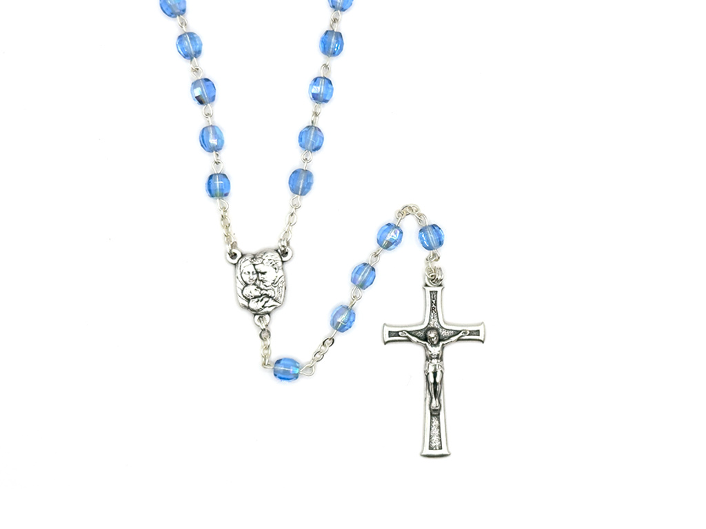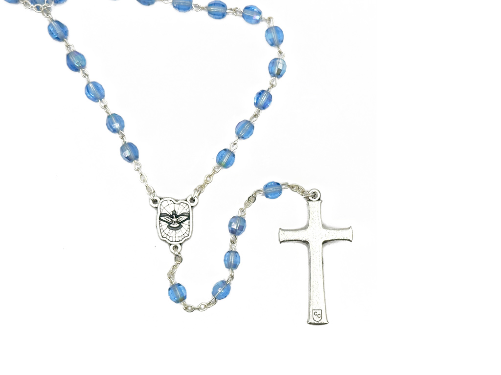 This rosary features faceted blue crystal beads that shimmer beautifully as they move through your hands in prayer. The silver-tone crucifix is finely detailed, and the center medal shows the Holy Family on the front. On the reverse, a graceful image of the Holy Spirit in the form of a dove reminds us of God’s constant guidance and peace. This devotional rosary serves as a gentle reminder of Mary’s loving intercession and the comfort found in the mysteries of Christ.