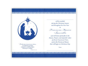 This Christmas Enrollment card features an image of the Blessed Mother tenderly cradling the Infant Jesus beneath the Star of Bethlehem. Inside, it includes the Scripture passage: “For this day is born to you a Savior… you shall find the Infant wrapped in swaddling clothes and lying in a manger.” (Luke 2:11–12)