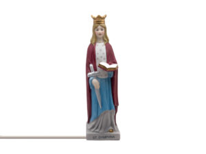 This 8” ceramic statue of St. Dymphna is beautifully crafted in full color. Hidden within the statue is a night light with an extension cord, casting a gentle glow that is especially comforting during the evening hours. This devotional gift will be sent to all benefactors who request it.
